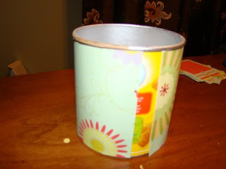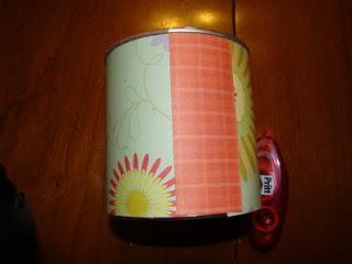 8. Attach your paper strip to your can. (I used hot glue for this) My strip does not reach all the way around so I need to add another little strip to cover the rest up.