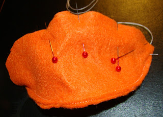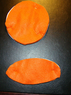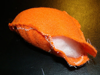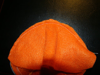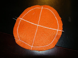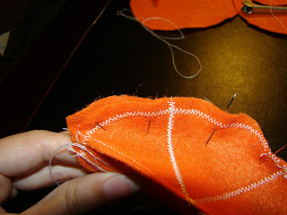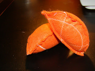 1.) Cut out pattern and pin them to orange felt. I pinned mine to more than one layer of felt since I am planning on making more than one. But, for one orange wedge you only need one of each shape.