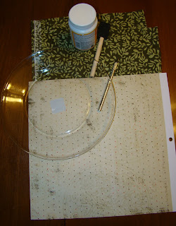 3.) Cut a piece fabric in a square that is about an inch bigger on each of the sides of the plate. (I know the plate is hard to see but it is clear)