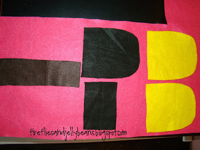3. Iron the freezer paper (wax side down) to where you want you word to be. Make sure you iron is set to WOOL setting for felt (or it will melt... I know I melted some on my other felt house!) Make sure all your letters are stuck to the felt.