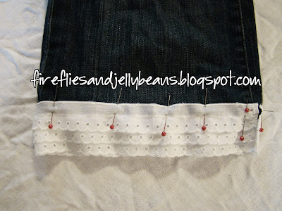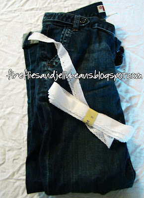 Here is a pair that I did with wider lace. I sewed the lace to the inside of the pants and left the bottom of the pant legs to fray a bit for added cuteness!