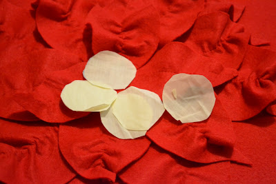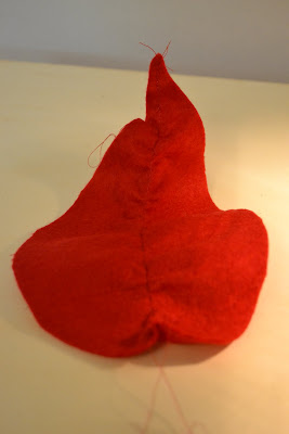 To give my petals more life, I took them to the sewing machine and ran a gathering stitch with red thread. When you gather, put your stitch length on the highest length you have (mine is a 4) then sew the line that you want without back stitching at the beginning. This will allow you to pull the threads and gather the fabric. I sewed right up to about 2" from the point of the petal, and then I back-stitched to keep my line of stitching in place.