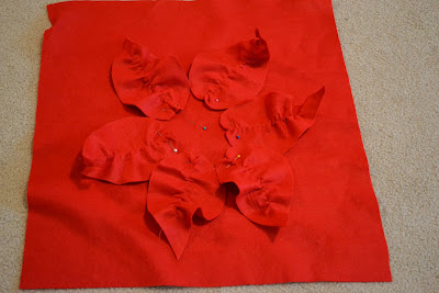 I found the middle of the front piece of my pillow and then placed my petals around the center and pinned them in place. Then I took it to the sewing machine and sewed just the bottom of the petals.