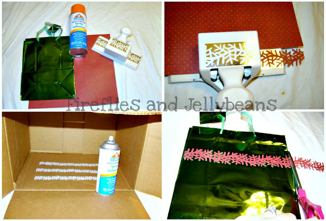 For my next gift bag I used scrapbook paper, deep edger punch and spray adhesive.