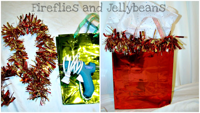 All you need is some garland, a gift bag and hot glue. Simple hot glue the garland around the top edge of the bag and you have a sassy little gift bag! I got all my supplies from the Dollar Store!