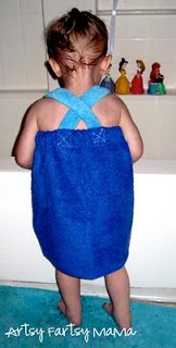 *As far as towel choices go, these size towels fit my 22 month old daughter. When choosing the towel for your own wrap, be sure to check that when it's turned horizontally, it's long enough to cover you {no need to flash anyone!} and will also wrap around you with overlap. Also, a thinner towel will be easier on your sewing machine. You can also purchase terry cloth fabric instead of a towel to guarantee a fit. Straps can be made from scrap towel pieces, a hand towel or wash cloth, extra terry cloth fabric, or even ribbon or cotton fabric.