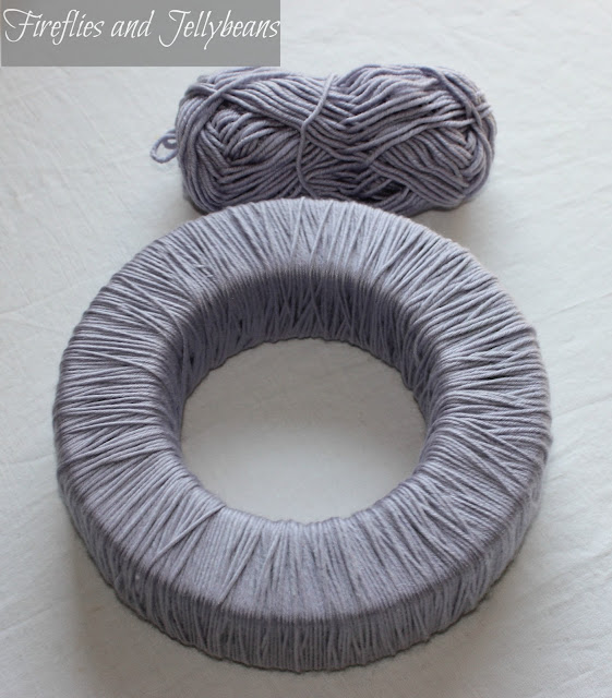 1. First wrap your wreath foam with the yarn. I used hot glue to secured the yarn to the back at the start and finish.
