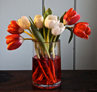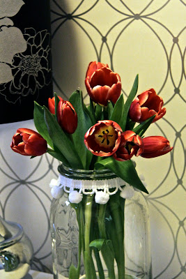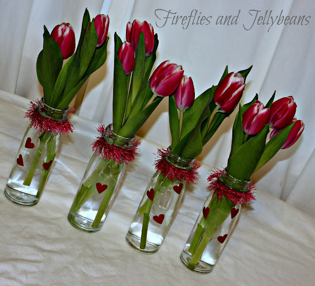 Tulips are my favorite flower. I love the simplicity of them! Give me tulips over roses any day! Tulips are easy to take care of and last up to a week! That is my kind of flower! So for Valentine's Day I would much rather get a bunch of tulips over any other flowers. So this Valentine's day I challenge you to think outside the box and use cut tulips in you decor! I did and i LOVE the results!