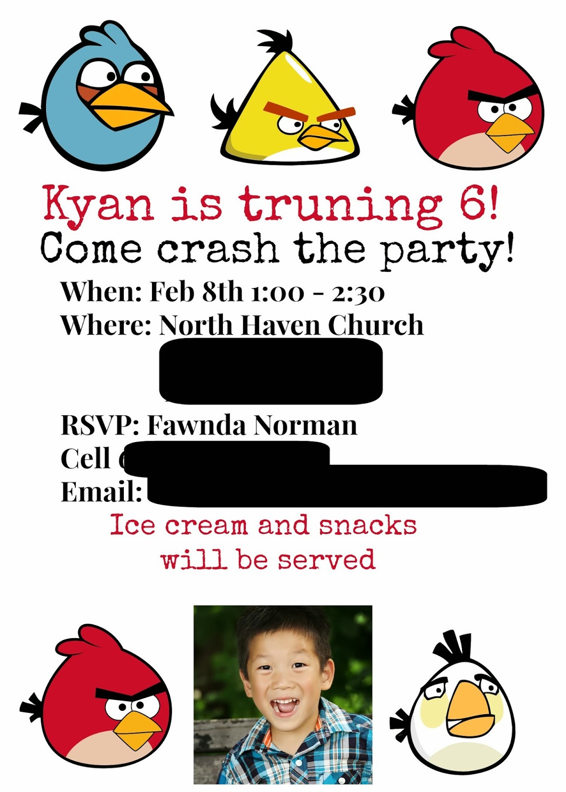 I made the invite using PicMonky and clip art from this FREE Angry Birds party download. (for personal use only!) There are all sorts of fun party printables in the download (that I didn't use because I was keeping it simple and my audience was 4-6 year olds!). I printed them as regular 4X6 photos and mailed them out.