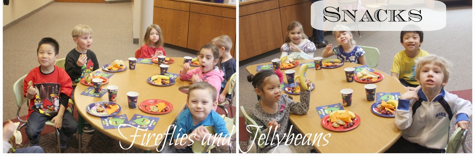 I got the mini-totes from Oriental trading co. I pre-cut all the shapes out of foam and bought the googley eyes and feathers from Michaels Craft Store (but you can also find them at the dollar store too). The kids arranged the faces and we helped the glue it on. These also ended up being their goodie bags!