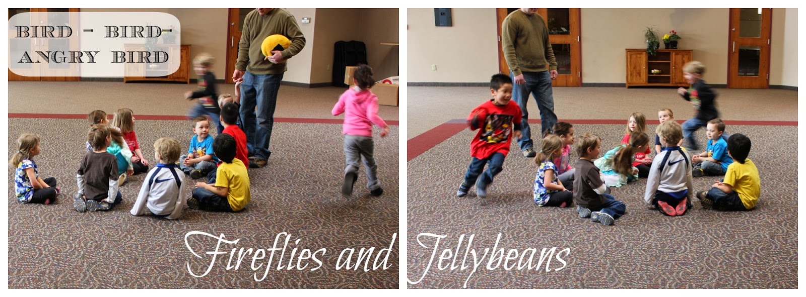 This is a version of Ships Across the Ocean - and also needs no props. One or Two kids are chosen to be piggies. They stand in the middle. The rest are Angry Birds- who are lined up on a line or wall. I yelled "Angry Birds- GO!" and all the kids ran across the room as the piggies try and tag them. If they get tagged they become a piggy too. The last 2 kids standing are the next rounds piggies to start. You can play several rounds!