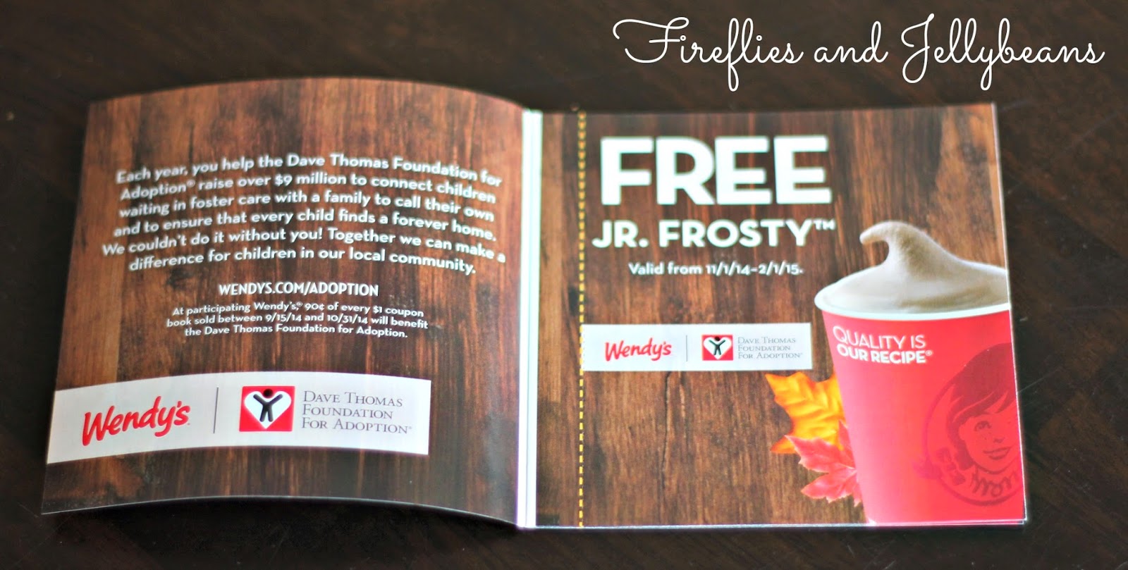 *Coupon book may contain coupons for 5 or 10 free Jr. Frosty™ treats. Prices and participation may vary. Ninety cents to every $1 coupon booklet sold between 9/15/14 and 10/31/14 will benefit the Dave Thomas Foundation for Adoption®. Coupons valid from 11/1/14 through 2/1/15. ©2014 Oldemark LLC