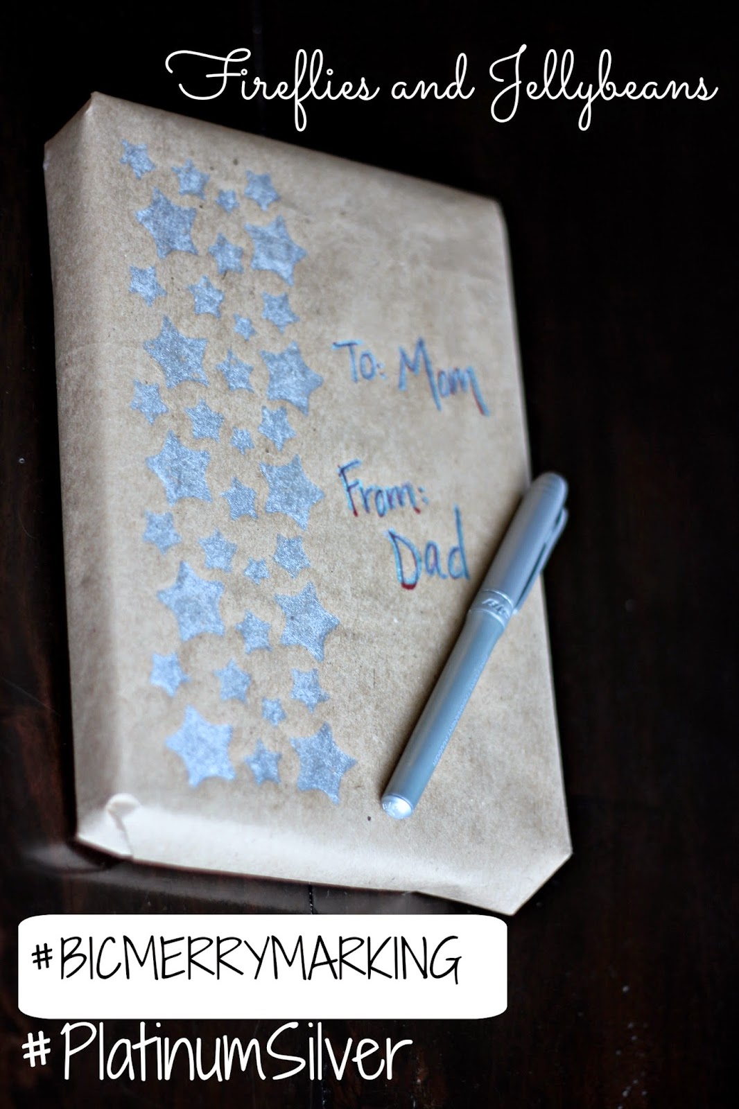 I used the metallic #PlatinumSilver to dazzle this gift. Just wrap a gift with white or kraft paper and use your BIC Mark-It™ markers to decorate. You can use stencils or just free hand! It also works great on gift bags!