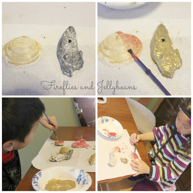 2. Paint the shells with either glitter paint or any color that matches your docore. We liked gold/ glittler red and silver. Get the kids involved!