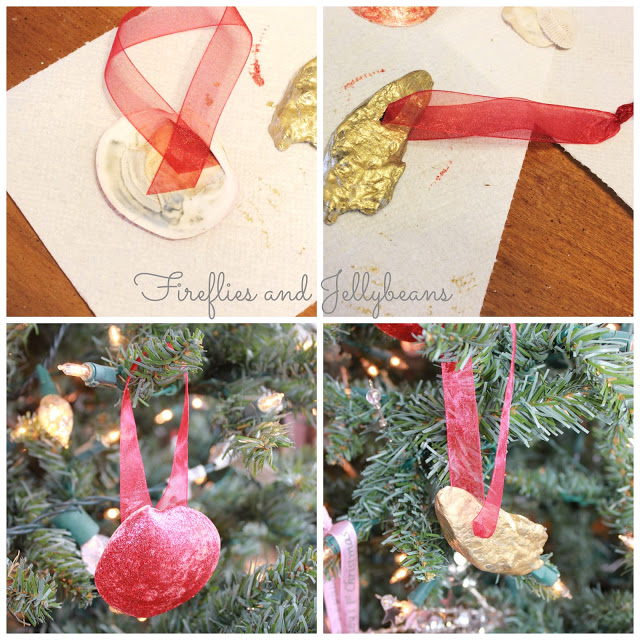 Growing up my family always got or made ornaments that had to do with what the past year held. So, I wanted to carry that on with my kids. A few years ago we went to South Carolina (to visit my sister) and collect a bunch of shells from the beach. So at home we picked out some shells and decorated them for our tree.