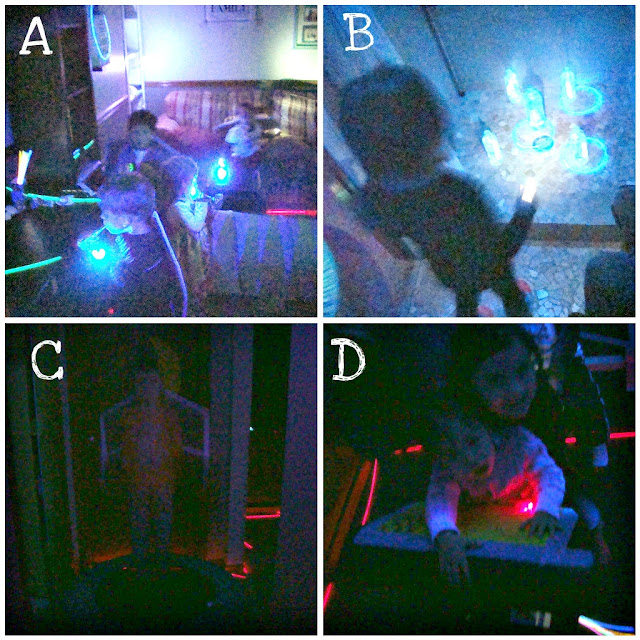 We had the basement decorated for space. We got lots of glow sticks and other glow stuff from the dollar store and used black lights. We used glow necklaces (straight) around the perimeter of the rooms to help kids see where they were going and not run into any walls. They loved using thier finger lasers in the dark too.