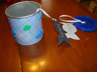 I also made one for my BIL birthday. He loves to fish so I cut out fish shapes and made a Stinger of fish come out. I made the can look like a net. At the bottom of the stinger I tied on a gift card to one of his favorite sporting good stores! Here is a pic of that: