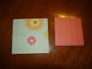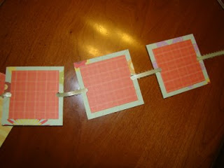 2. Cut out squares to fit into your can. I cut two sizes. 3' squares and 2 1/2' squares to make the framed edge. It will depend on your can how big your squares can be. suggest trying a size on the bigger side and than you can trim off if you have to. It is easy to cut off than it is to add more on. I also though circles would be cute but I don't have a circle cutter. I make sets of squares. You can make as many or few as you have pictures for. 8 fits into my can nicely and doesn't make too long of a string to pull out.