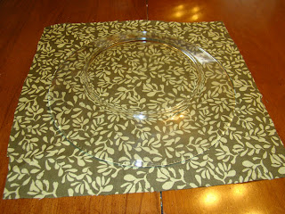 3.) Cut a piece fabric in a square that is about an inch bigger on each of the sides of the plate. (I know the plate is hard to see but it is clear)