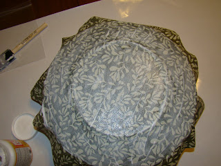 11.) When it is FINALLY dry cut off the extra fabric by cutting around the plate as close as you can. If you are worried about the edges frying you can brush a little more Mod Podge around the edge.