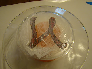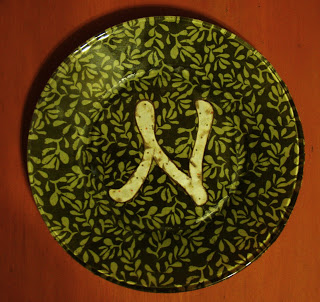1.) Make your monogram. I free handed my "N" but you could print a letter off of your computer on the back of your paper using the Mirror Image Printing option. I also traced around the bottom of my plate to know how big to make the letter.