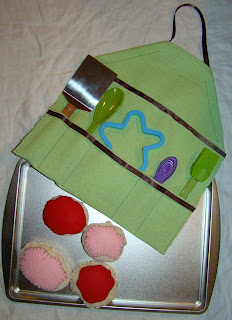 Now, in time for the gift giving season. I am selling these cute cookie baking sets: The set includes: Personalized Apron, 4 felt sugar cookies, cookies sheet, and baking utensils