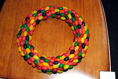 I bought a wreath form from the Dollar tree, and 2 bags of Jelly beans. Originally I bought the regular ole' jelly beans, and I started hot gluing. I got the wreath finished, and realized, I didn't like it AT ALL!!!!!!!