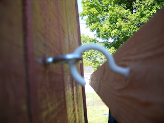 2. Screw eyes onto mounting surface (garage, tree, etc.), about 3' apart. You'll have to decide on the best height for you. We made it so it was just above my husband's head, so he could walk under it when it's not in use, and it's within reach for me. Use a drill to help with the holes if you need to. You'll need to measure the exact distance between eyes so they're even with the hooks. Since one side of my clothesline hangs from a post on the porch, they had to be closer together. For this one, we hung the eye screws on the sides of the post to give a little more distance between them for better leverage.