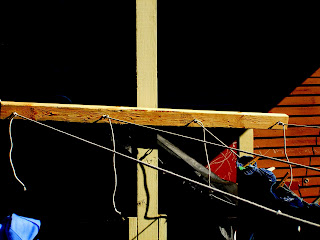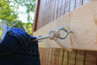 7. Tie rope to eyes on each block, stringing across to opposite block. This might take two people - one to hold the rope taut, the other to tie the knot. My hubby looked up rope tying on the internet to find a good knot for this. Cotton rope is pretty stretchy, so you want to make sure the ropes are pretty tight. You can trim the excess rope if you want to, but I didn't, in case they ever need to be retied.
