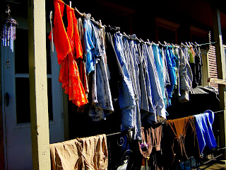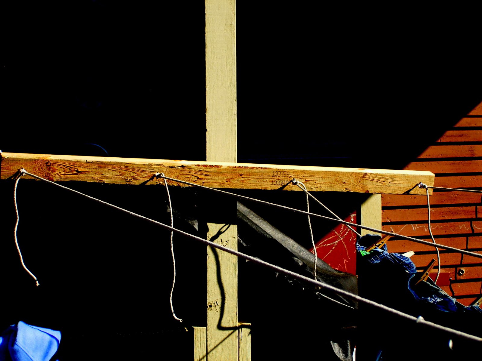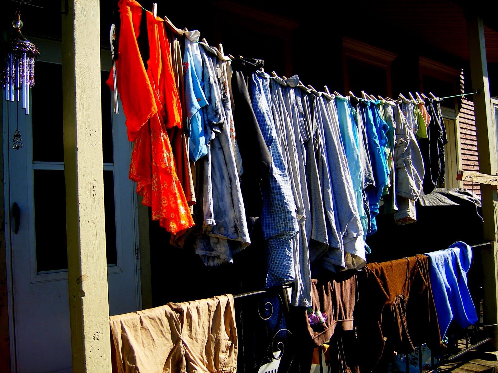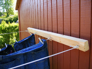 A laundry tip for those of you who might not have space for this: Before we built this, I just had one cord strung across my porch. There wasn't space to hang very much, but I would scrunch everything close together, using only one pin for each item and let them air dry as much as possible until the next load finished in the washer. I also hung big things like pants over the porch rail. Then I'd take everything down and throw it in the dryer. Even though it wasn't completely dry, it would be at least partially or mostly dry, and it wouldn't need very much time in the dryer. And that dryer time would also fluff out the wrinkles and stiffness from hanging so close together. For me, it was a way to save some energy and money, with limited space for hanging.