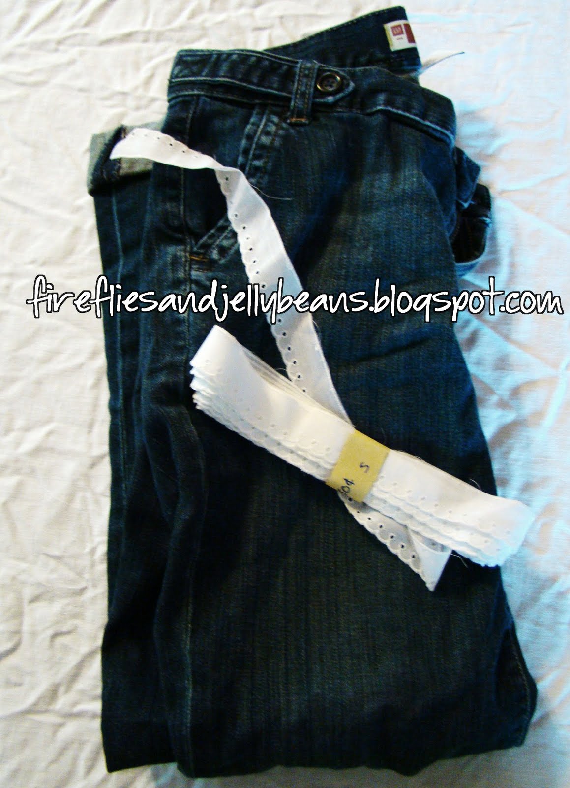 Here is a pair that I did with wider lace. I sewed the lace to the inside of the pants and left the bottom of the pant legs to fray a bit for added cuteness!