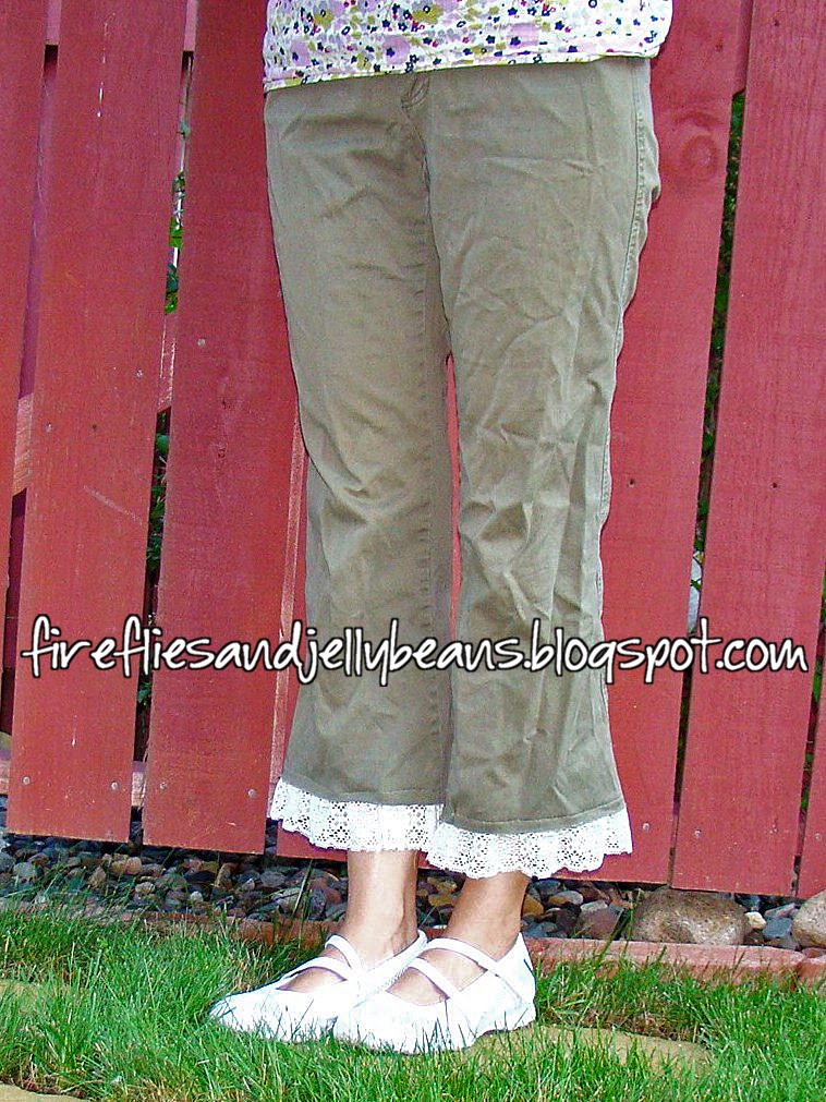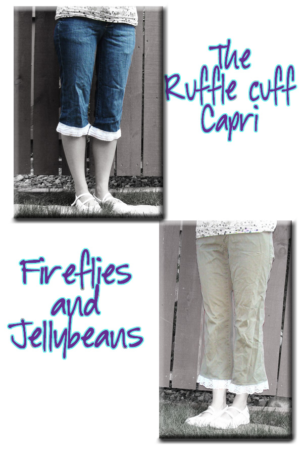 I love the look of the ruffle cuff Capri's that are out there for little girls and I wanted to fancy up some of my pants too! I was talking with my SIL and I told her that I wanted to add a fabric ruffle to my Capri cuff but I also wanted to remain neutral. She suggested lace and I thought it was a FABULOUS idea!