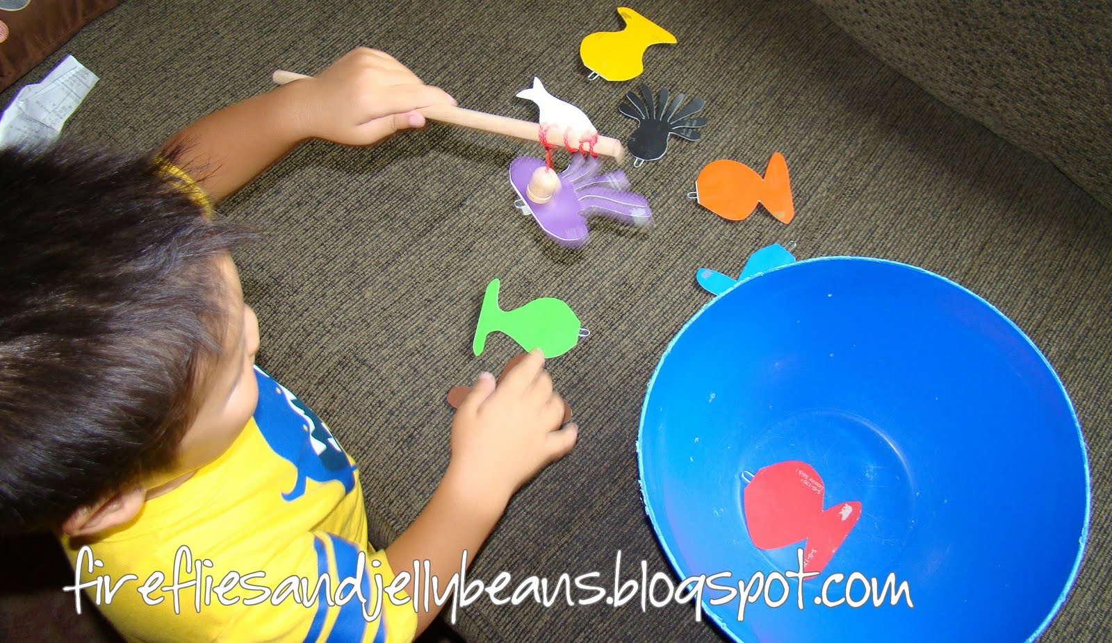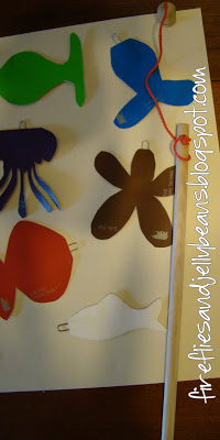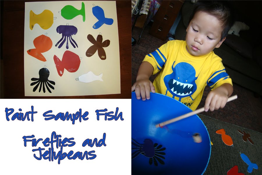 Here is an easy way to have some fun with your toddler! Go fishing with Paint samples!