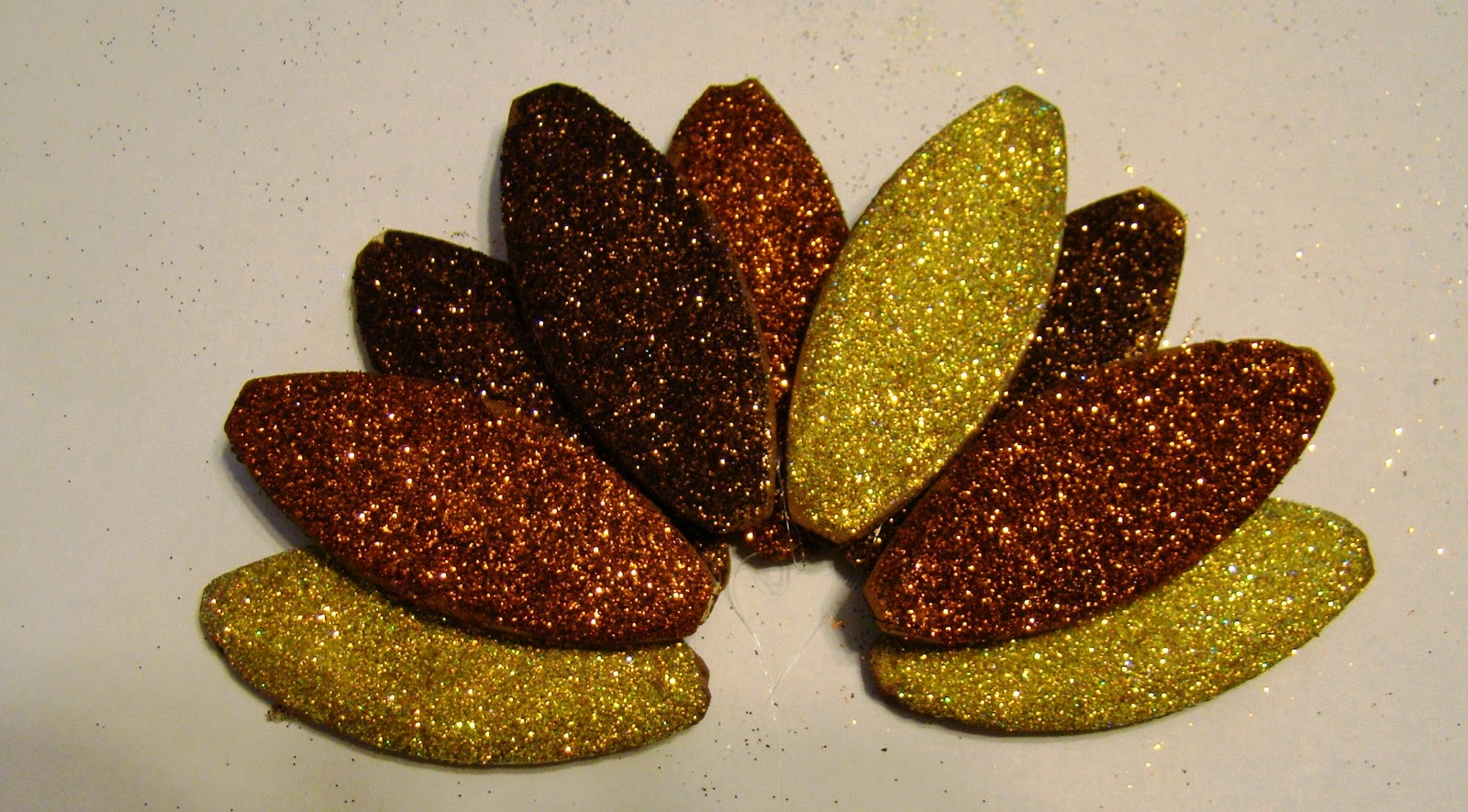3. Once the glitter has dried completely you can arrange the biscuits into a turkey feather pattern. Hot Glue to keep them together.
