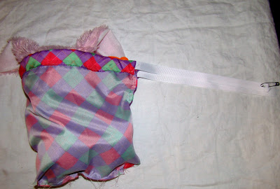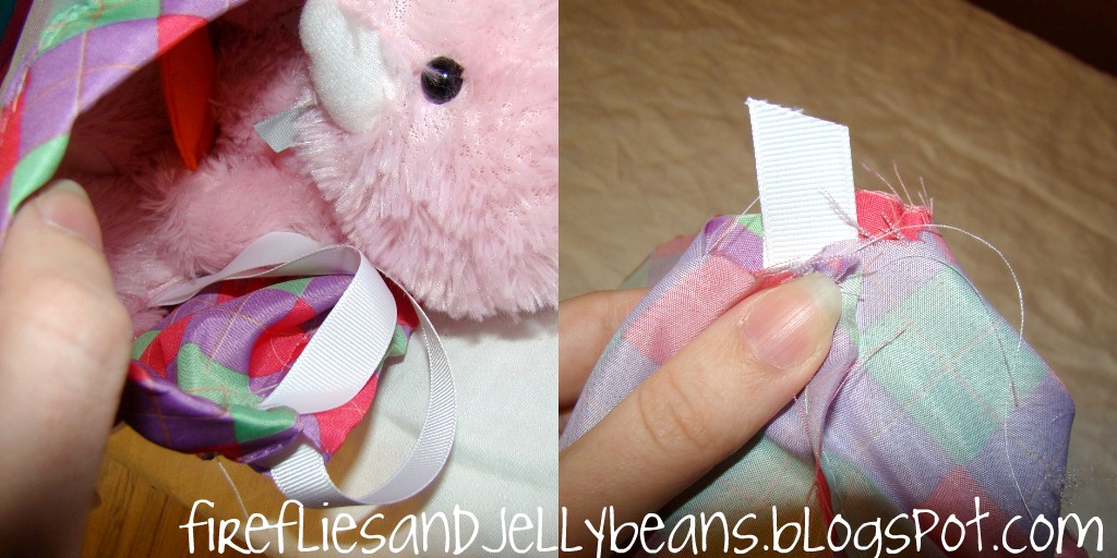 11. Put your ribbons into the INSIDE of the bag and pull about 1/2 an inch out of the square opening on the bottom of the back. Square off the ends of the bag and sew the ribbons in the seam. repeat on the other side.Turn your back right side out!