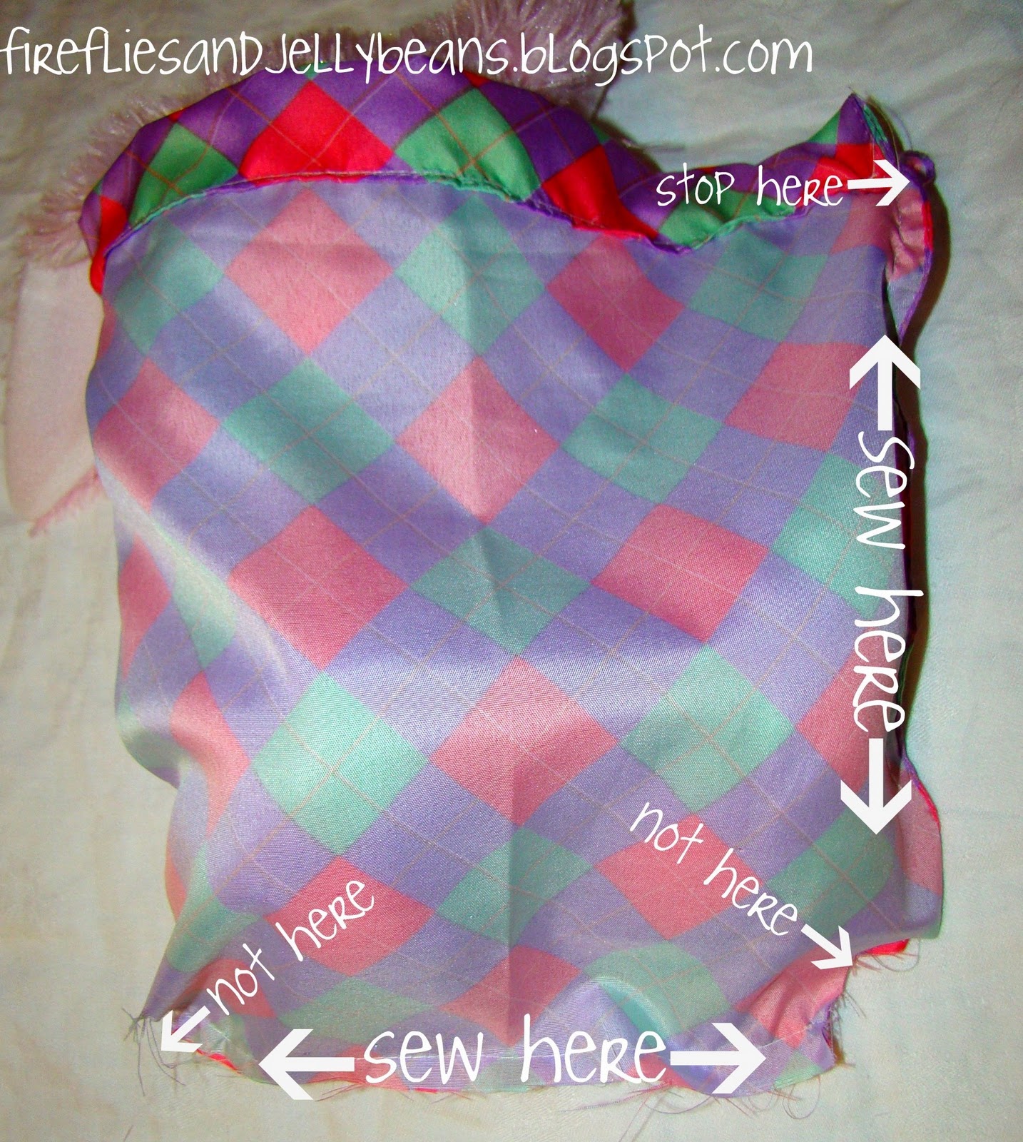 Fold your fabric over the plush toy so that right sides are together. Sew down the sides and bottom, but NOT THE CORNERS!! Also stop sewing when you get to the casing.