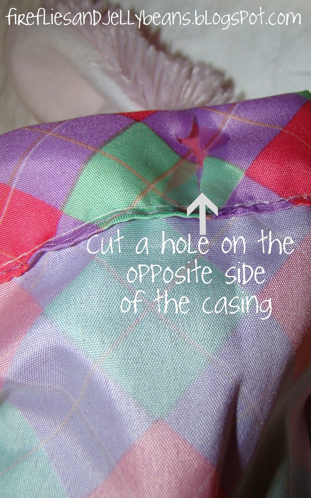9. Pull on of your ribbons completely through one hole on one side of your casing. (I use a safety pin to help)