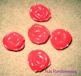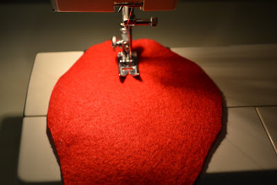 To give my petals more life, I took them to the sewing machine and ran a gathering stitch with red thread. When you gather, put your stitch length on the highest length you have (mine is a 4) then sew the line that you want without back stitching at the beginning. This will allow you to pull the threads and gather the fabric. I sewed right up to about 2" from the point of the petal, and then I back-stitched to keep my line of stitching in place.