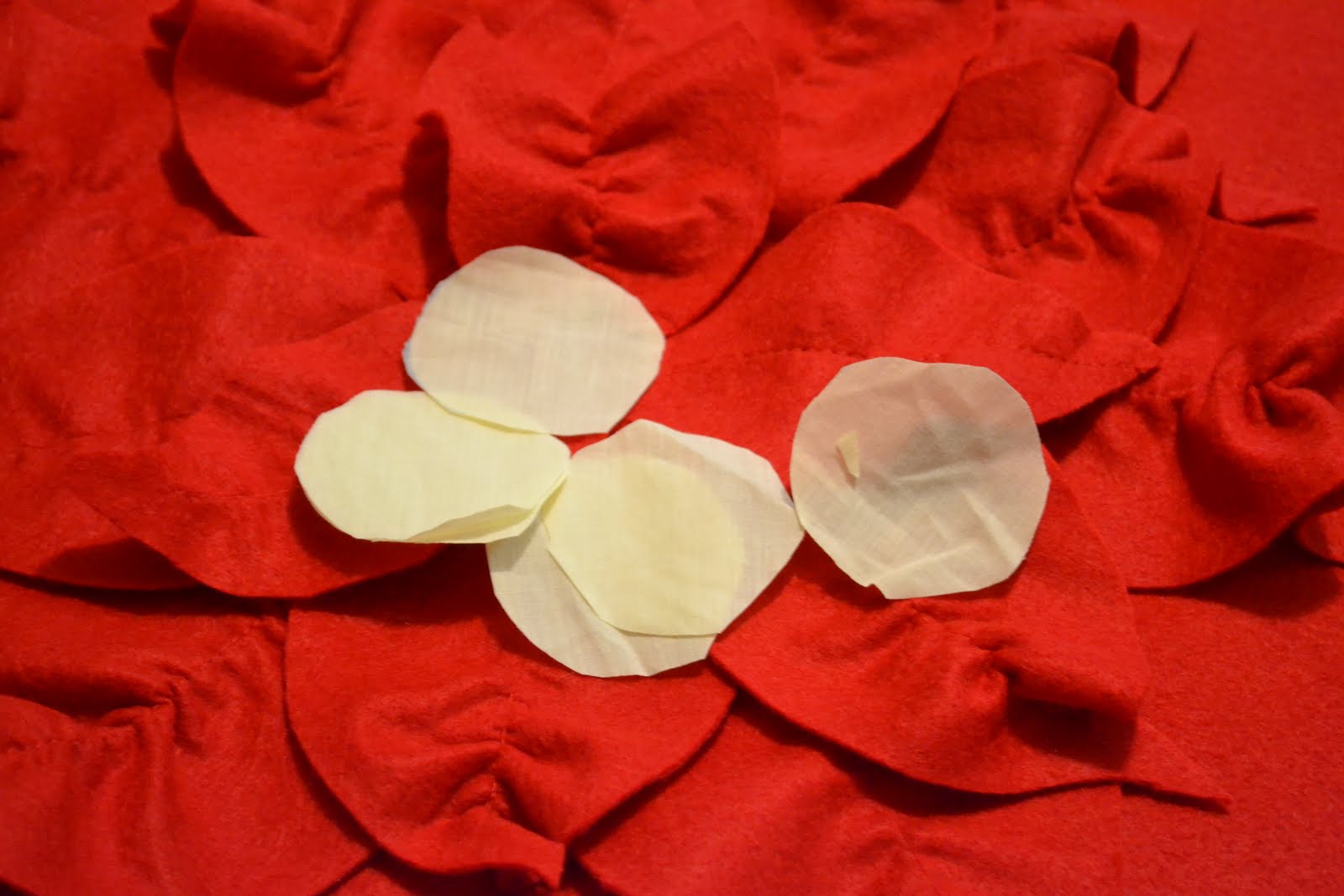 When I had my petals in place I took some yellow scraps of fabric and cut 2" diameter circles to help form the middle of my poinsettia.