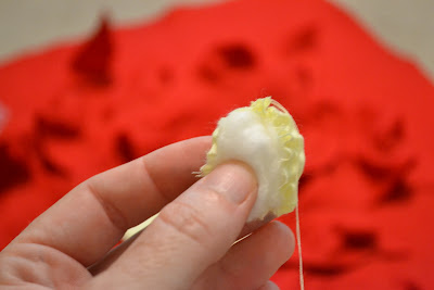 I took a needle and thread and ran a running stitch around the perimeter of the circle. Then stuffed each circle with a cotton ball (it was the perfect size). I then sewed up the back of the ball and hand sewed it to the middle of the flower. I used eight balls in total.