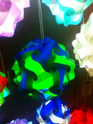 I saw these lamps while walking around... it is made up of plastic pieces... I am thinking of trying to recreate it with cut-up milk cartons... what do you think? Any ideas?