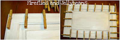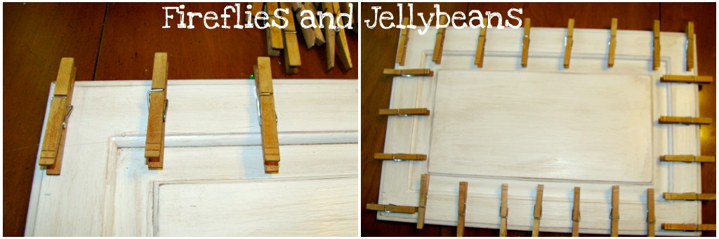 I hot glued the clothespins to the cupboard door. I tried to space them out as evenly as possible.