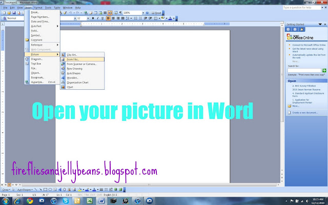 5. Open your picture in a word doc. Click on INSERT - down to PICTURE - to FROM FILE. Now find your picture that you just saved and open that.