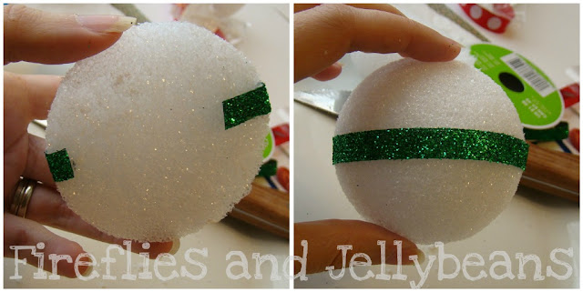 2. Use your glue gun to put a line of glue from one side all the way around to the other around the outside of the ball and put a piece of ribbon over it.
