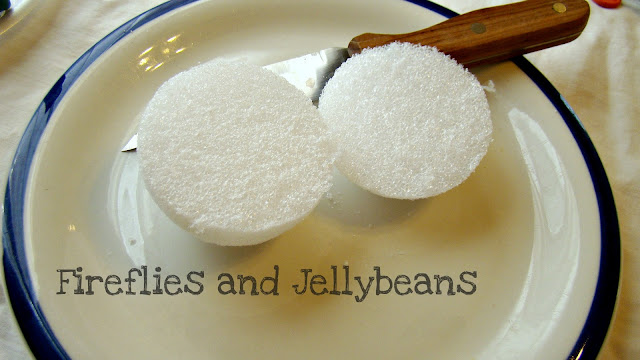 1. Cut your Styrofoam ball in half.  I used a steak knife to cut mine and it worked great.  Use a plate to collect to scraps that will fall off.