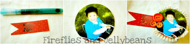 5. Decorate the ball with a name/date tag and a picture of your child printed on card stock (cut into a slightly smaller circle).  I also added some buttons.