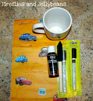 Supplies:MugShelf paperDecoArt's Chalkboard PaintDecoArt's Glass Paint MarkersFoam Brush