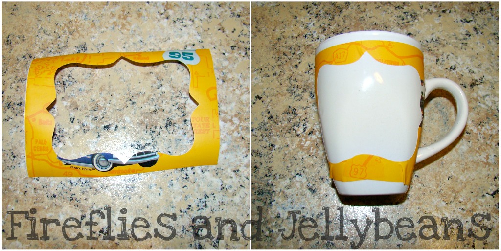 1.Cut out a frame out of the shelf paper. I get my shelf paper from the Dollar Tree. I used my Silhouette to cut out the frame shape but you could use and X-acto knife or scissors too. Place the frame on the mug.
