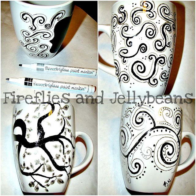3. Use the Glass Paint Markers to doodle on your design around the out side of the mug. I made 3 different mugs with 3 different designs. You can google "doodles" for inspiration.