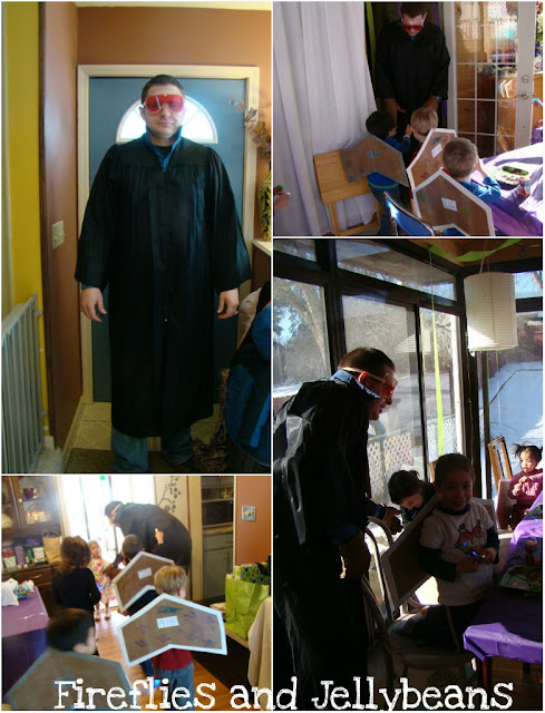 Once the kid were getting finished with their snack We had Zurg come and crash the party. My hubby gets the dad of the year award for dressing up like Zurg. He came in and let all the kids chase and attack him. It was perfect time for them to use all their space ranger skills they had just learned!